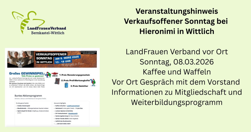 Ob Erzieherin oder Landwirtin, ob Floristin oder Ärztin, ob Hausfrau, Selbstständige oder Angestellte, ob jung oder alt - wir sind offen für alle Frauen in der Region. Zusammen arbeiten wir LandFrauen daran, das Leben auf dem Land immer etwas besser zu machen. Mit rund 1.200 Mitgliedern und mehr als 40 Ortsvertretungen ist der LandFrauen-Kreisverband Bernkastel-Wittlich eine starke Interessenvertretung und eine wichtige Institution für Bildungs- und Öffentlichkeitsarbeit im ländlichen Raum.